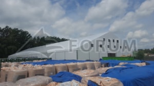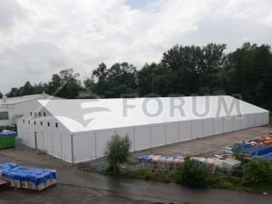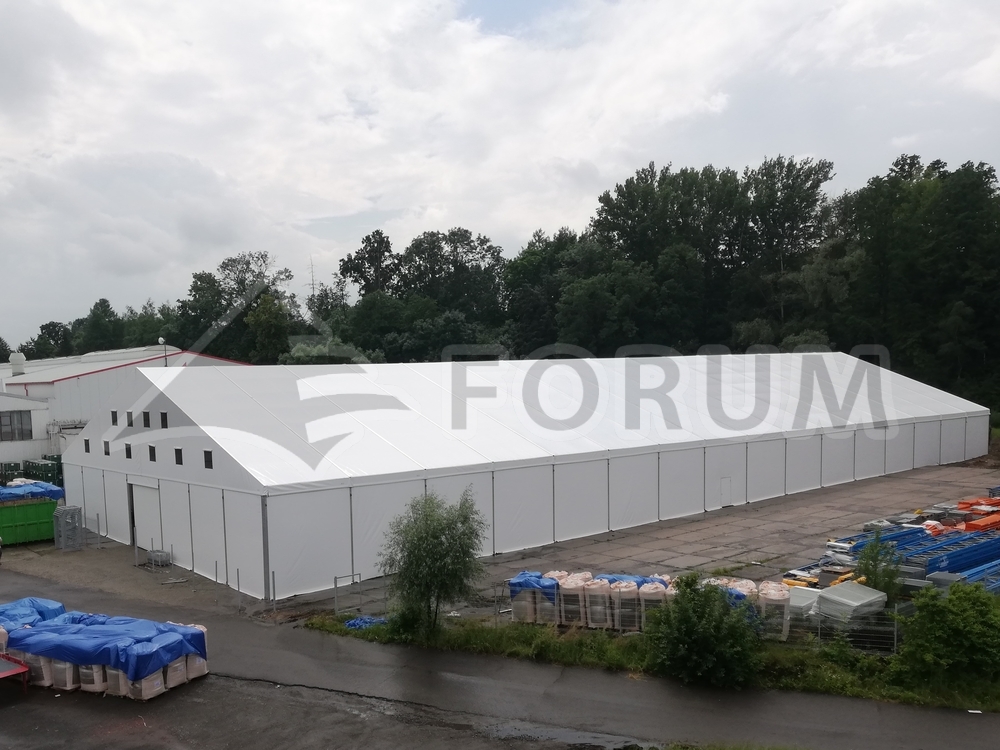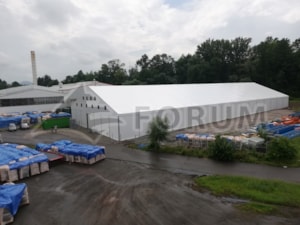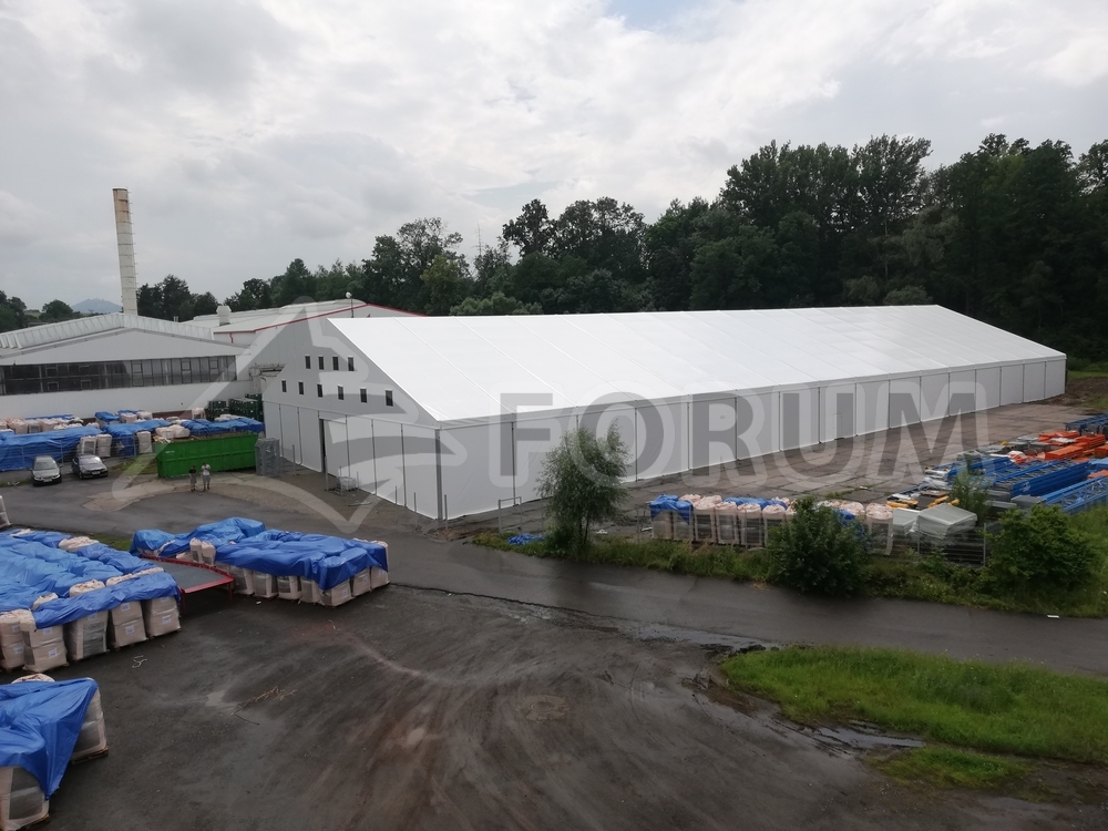 Uvádíme další velkou realizaci textilní stanové haly. Tentokrát pro firmu Hanwha v Kuníně. Hala stavěná na šikmém podkladu z betonových panelů. Výškový rozdíl až 1,5m je vyrovnán samotnou konstrukcí haly. Plošná výměra 30x80m, stěnová výška 4,4-5,9m, hala osazena posuvnými plachtovými vraty a uníkovými východy.