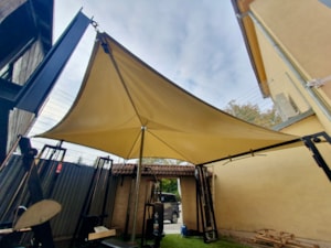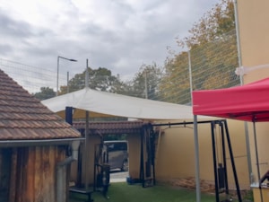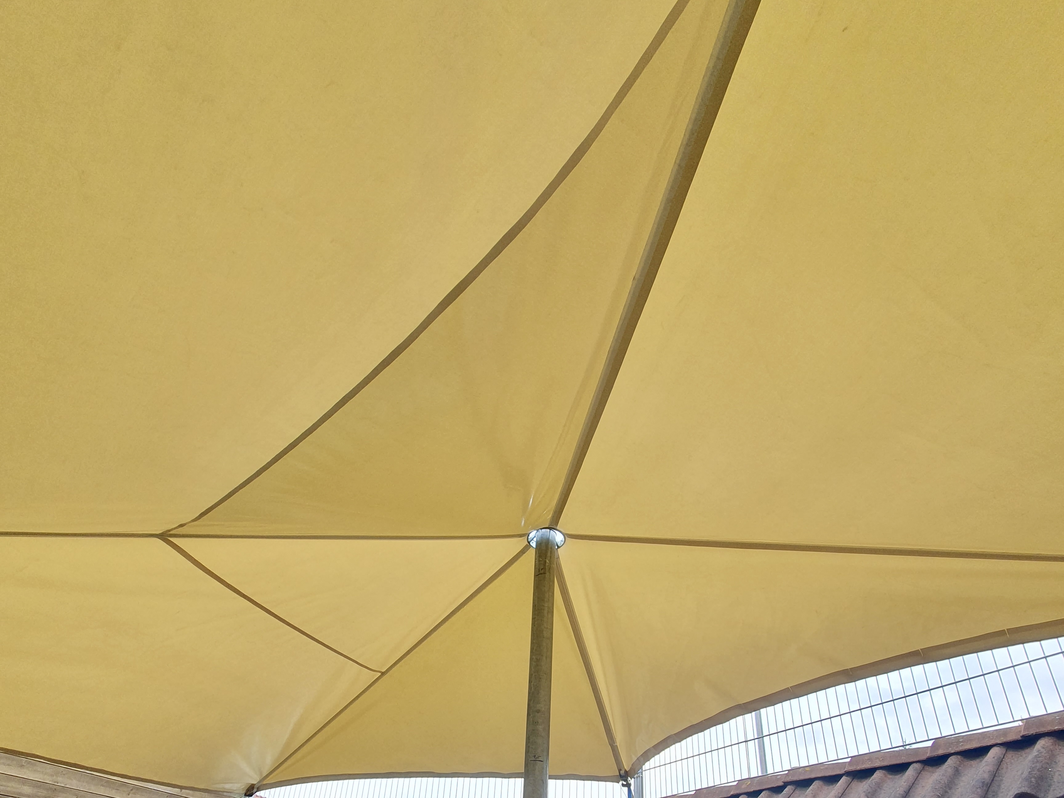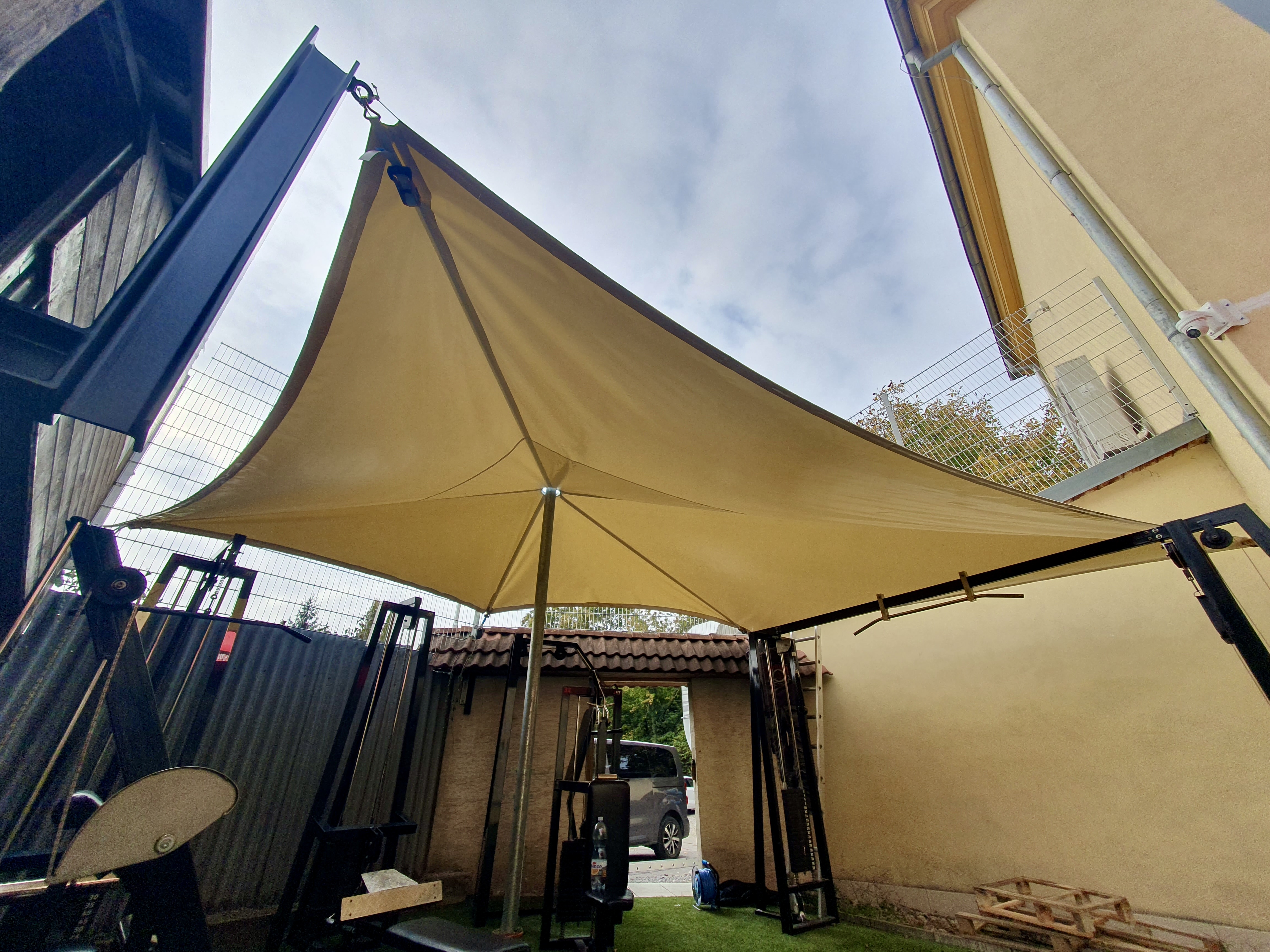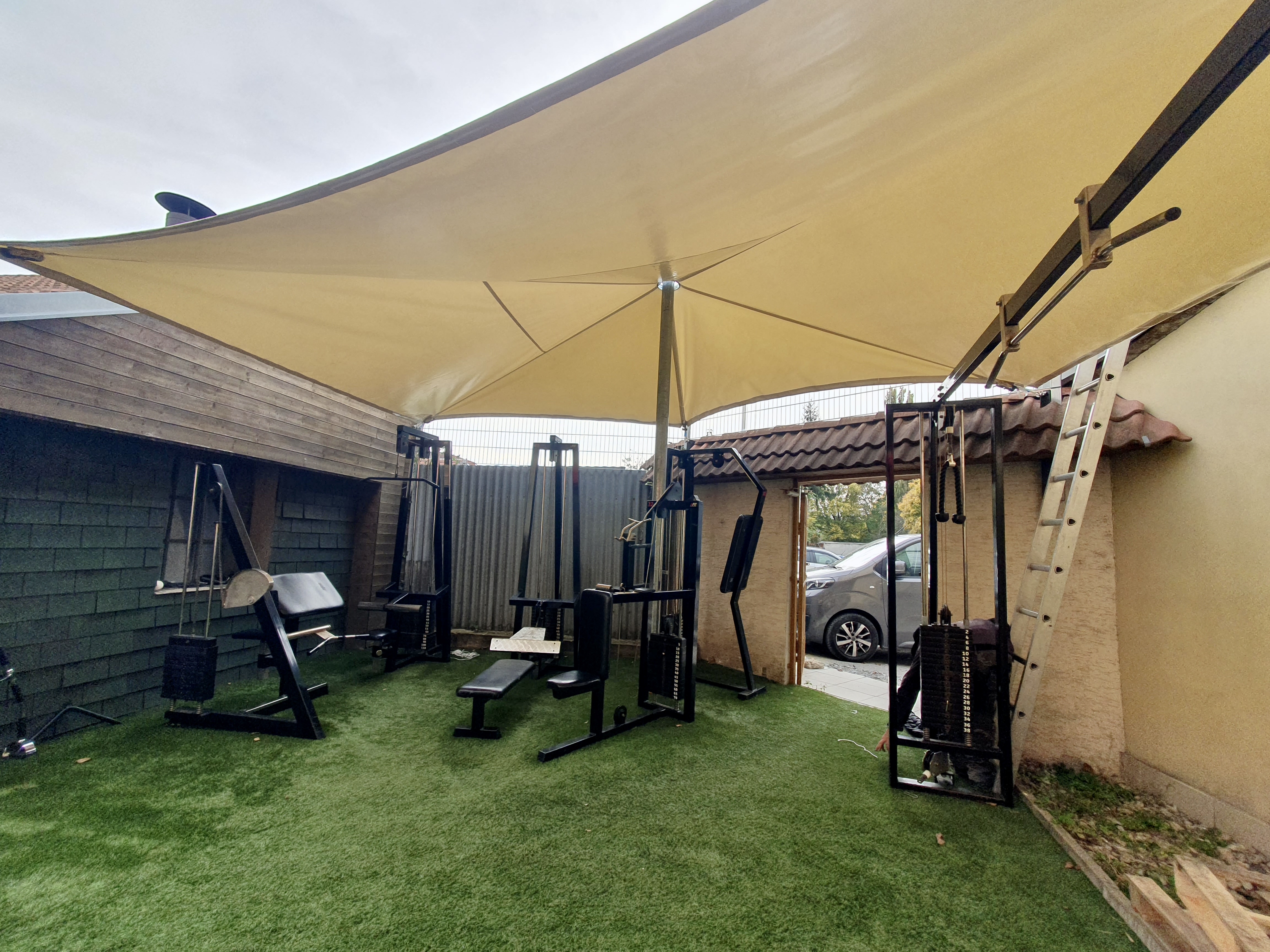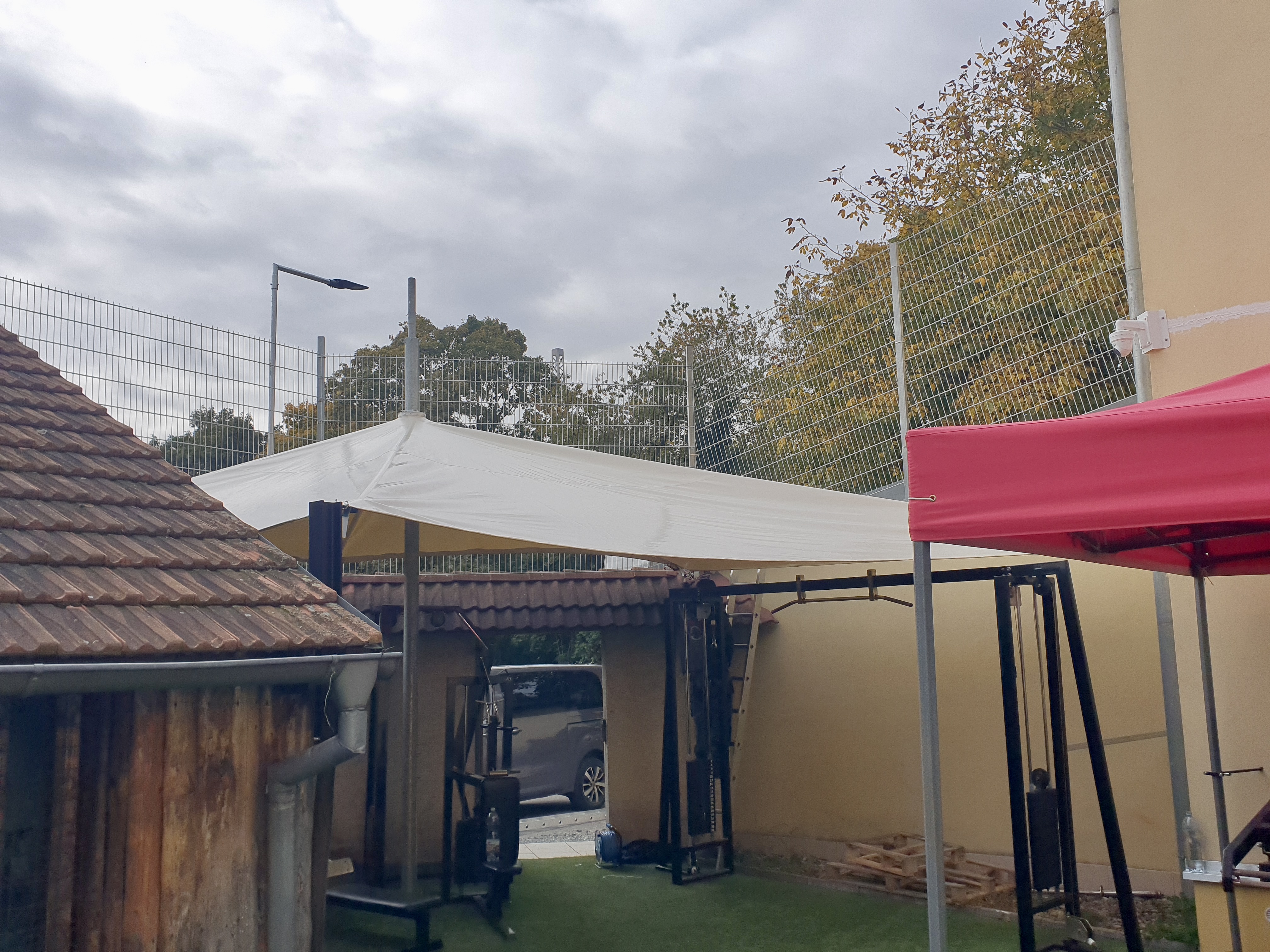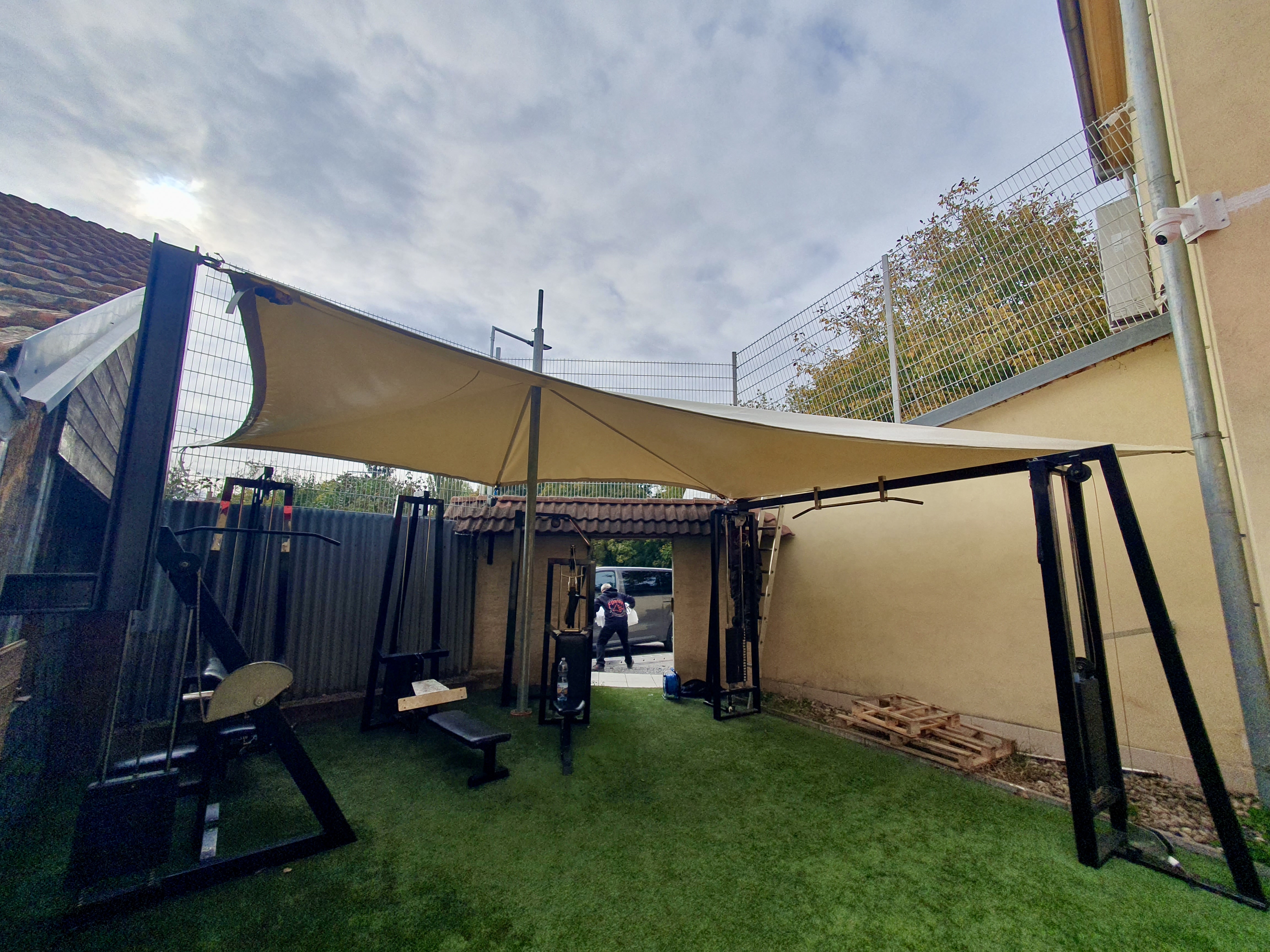Po konzultaci s majitelem brněnské posilovny AFIT jsme navrhli tvarovou clonící plachtu venkovního posilovacího prostoru. Přes stávající sloup veřejného osvětlení jsme pomocí závěsného prstence, vypnuli clonící plachtu do 5 kotevních stěnových úchytů. Vše předem promyšleno, zaměřeno, připraveno a instalováno. Zakázková výroba se vším všudy. Zhruba 30m2 zastřešeno. Bodybuildeři tak mohou svá těla ladit i venku za deště a větru, nic je nezastaví :).