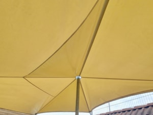 Nezvykle 3D tvarovaná clonící plachta venkovního prostoru dvorního traktu brněnské posilovny AFIT.