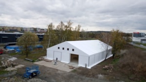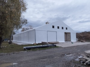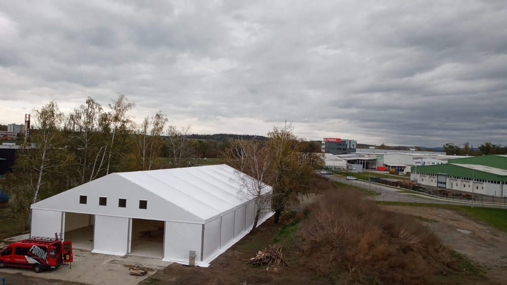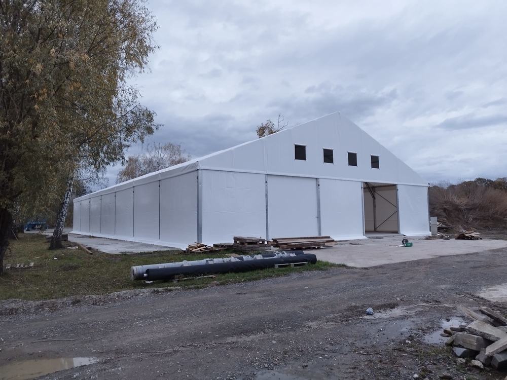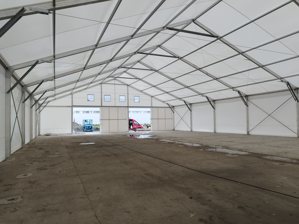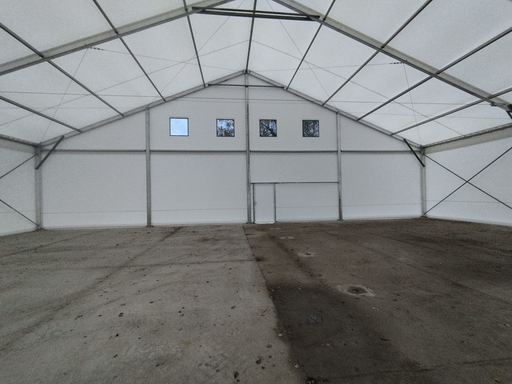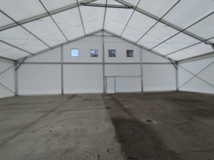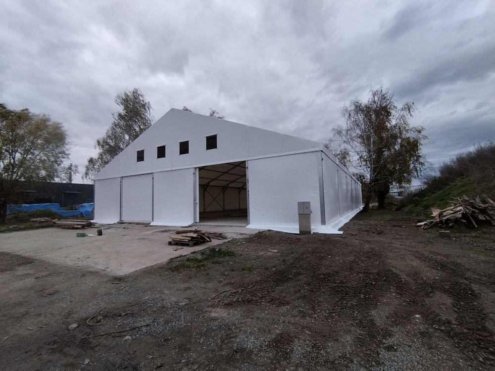 Ukázka symetricky umístěných čelních vrat. Umožňují tak zavážení materiálu do dvou řad zároveň. Vyrobeno pro společnost Norsol z Přerova. Plachtová hala 20x35m s boční stěnou 4m. Založeno na základové betonové desce. Dvoje přední vrata pro navážení. Prodloužení spodního lemu přes okraje základové desky zajišťuje odvod dešťové vody od stavby. Zadní únikové dveře pro předepsanou bezpečnost.