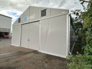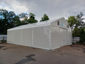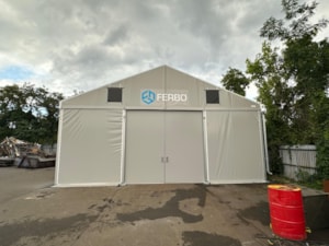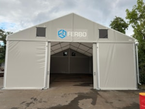 Stanová hala 10x16m s boční stěnovou výškou 4m dodaná pro společnost Ferbo v Olomouci. Modulová konstrukce se zkrácenou délkou kroku 4m, bílá střešní plachta, decentní šedý odstín stěnových plachet s logem firmy, čelní střední dvoukřídlá posuvná plachtová vrata, štítové větrání a okap. A můžete skladovat. Rychle, snadno a finančně nenáročně.
