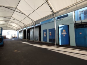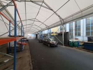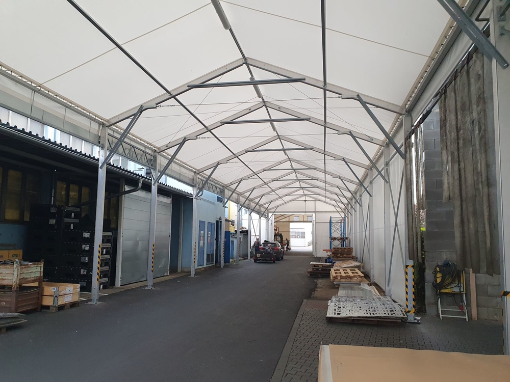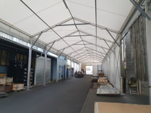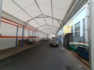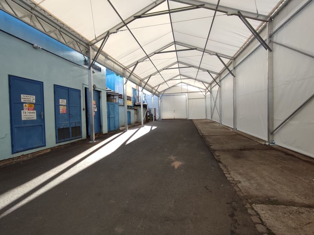 Pro výrobní firmu Kovo-Klobás z Brna jsme navrhli a vyrobili plachtový přístřešek rozměrově přizpůsobený omezenému stavebnímu prostoru. Vyplňuje tak zcela skladovací venkovní prostor mezi výrobními halami. Výškově zvýšená stavba s možností bočních vjezdů do různých částí stávajících budov, okapový systém svedený proti spádu stavební plochy. Rozměry plachtového přístřešku 7,6x40,5m, boční stěnová výška 4,7m, různá modularita konstrukčního kroku, boční křížové zavětrování nahrazeno příhradami.