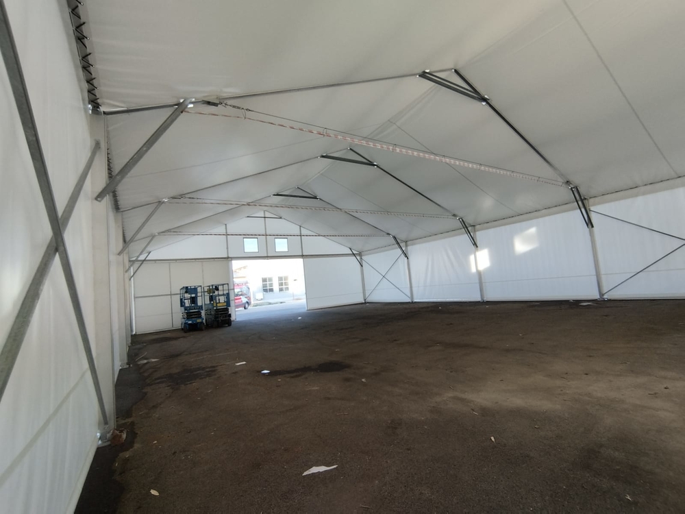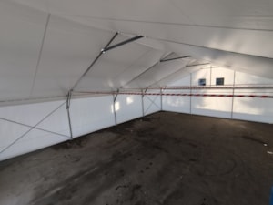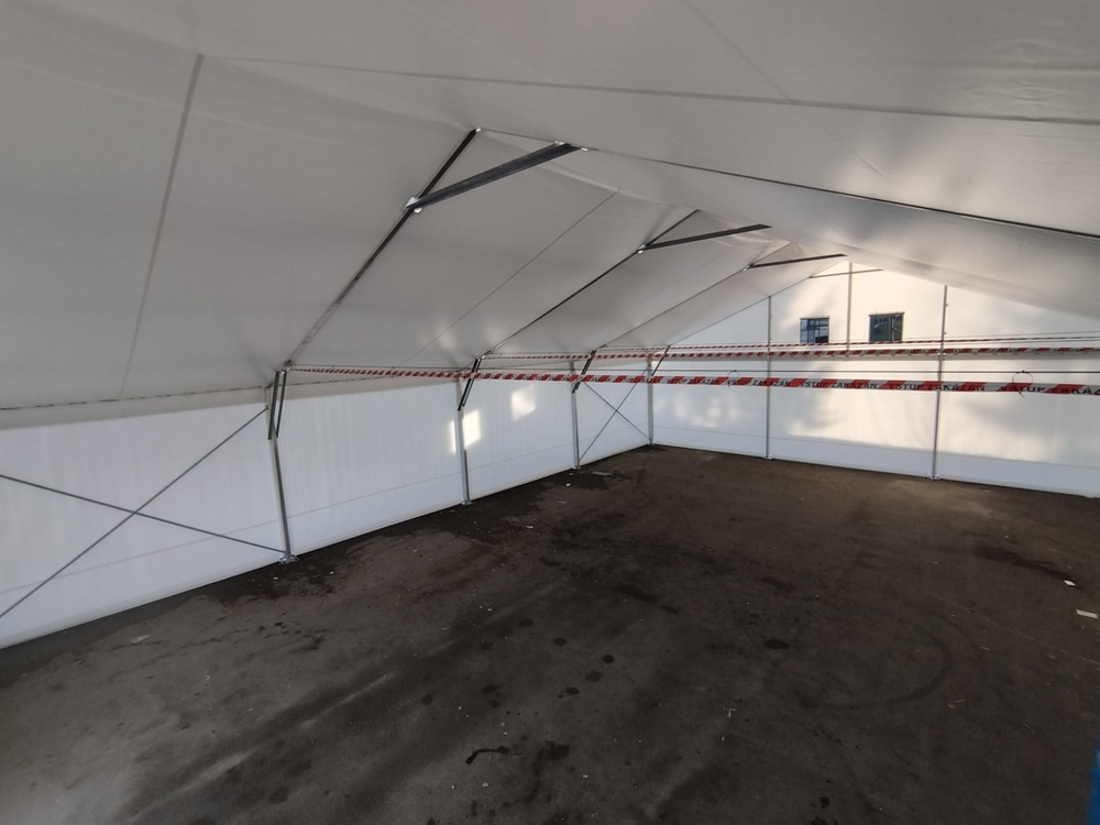 Často vyskytující se problém v zimních měsících u plachtových hal je tvoření kondenzační vody na vnitřní stěně plachtové střechy. Vzniká obvykle výkyvem venkovní teploty mezi nocí a dnem nebo případně vlhkostí nashromážděnou uvnitř haly. V noci se tak může vyskytnout na vnitřní straně plachtové střechy námraza, která pak vlivem vyšších denních teplot a hlavně za svitu slunka, se pak přemění na vodu a může způsobit určité komplikace uvnitř plachtové haly. Tento nežádoucí jev se dá vcelku snadno a stoprocentně odstranit použitím druhé vnitřní plachtové vrstvy. Zde ukázka řešení osazení tohoto pláště, který odvede případný kondenzát mimo střešní plochu plachtové haly.