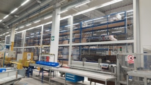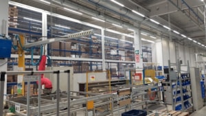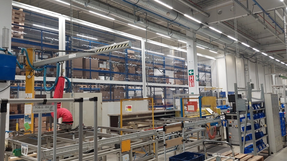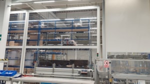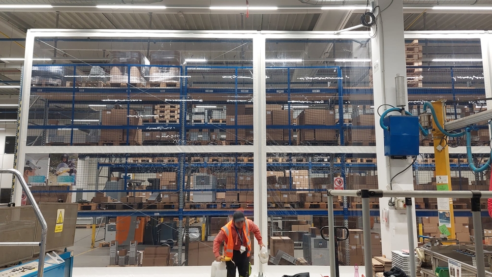 Samostatně stojící předěl mezí výrobní linkou a zakládacím regálem. Zabránění prašnosti a průvanu směrem k výrobní lince. Zajištěn tepelný a bezprašný provoz obsluhy linky bez světelného zatemnění. Zakázková výroba pro společnost Siemens v Mohelnici. Rozměr na výšku 5,5m a na délku 26,2m. Díky rámové ocelovo hliníkové modulární konstrukci je možnost snadné demontáže a přemístění na jiné místo. Zcela funkční výrobek s výhodou umístění i na jiném místě.