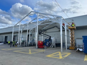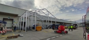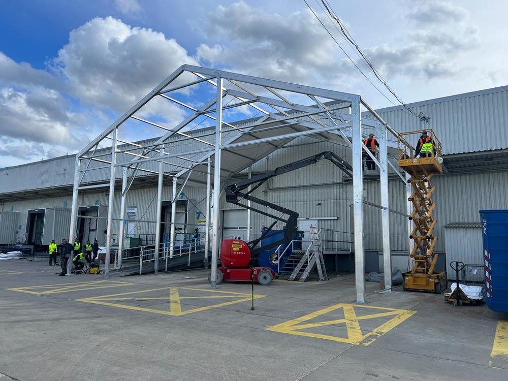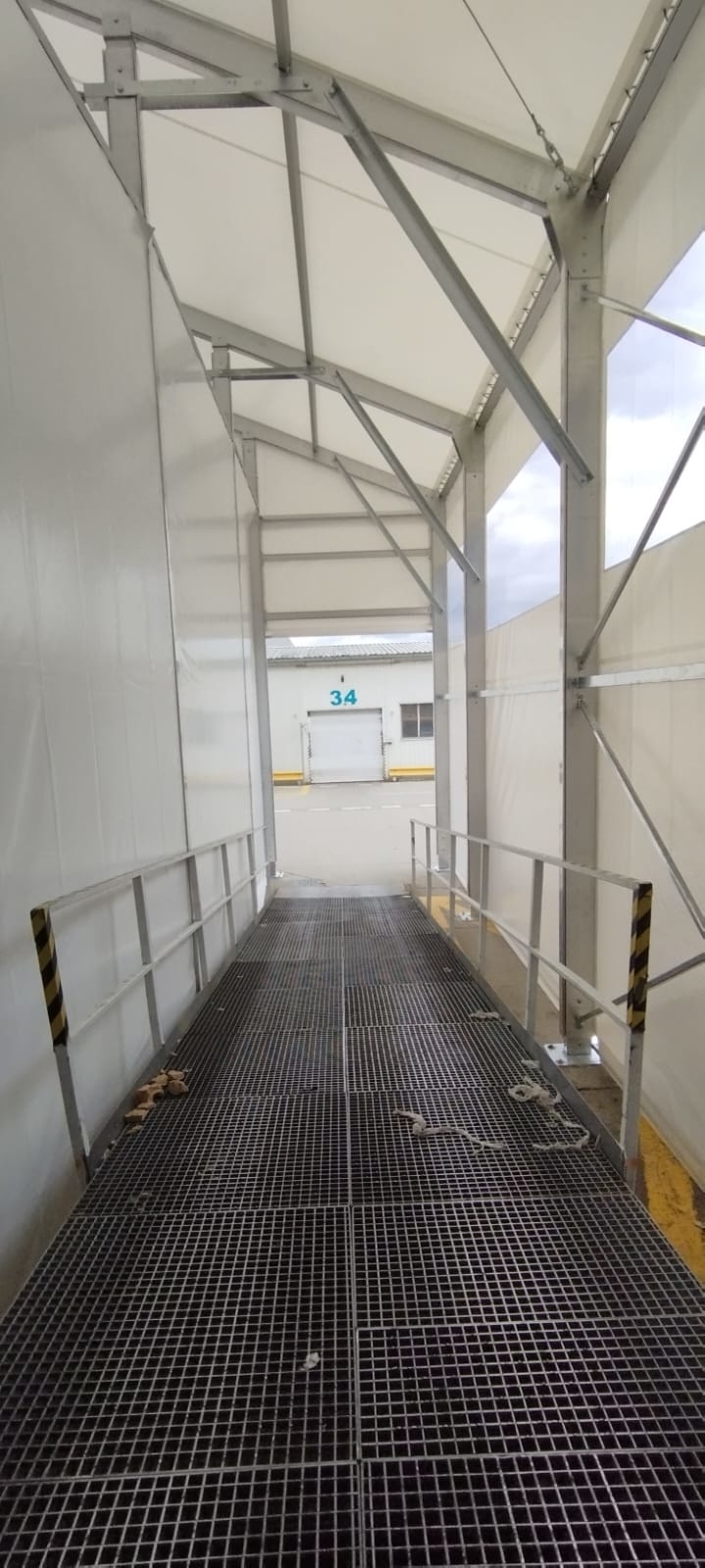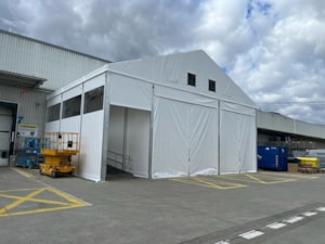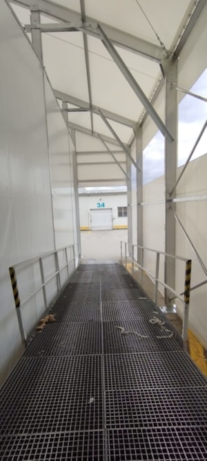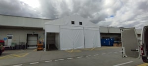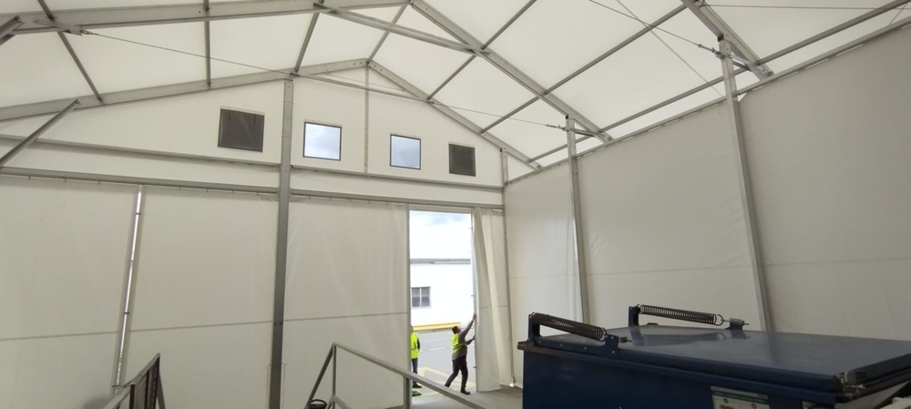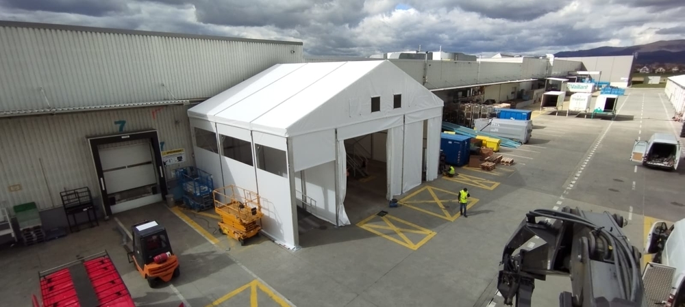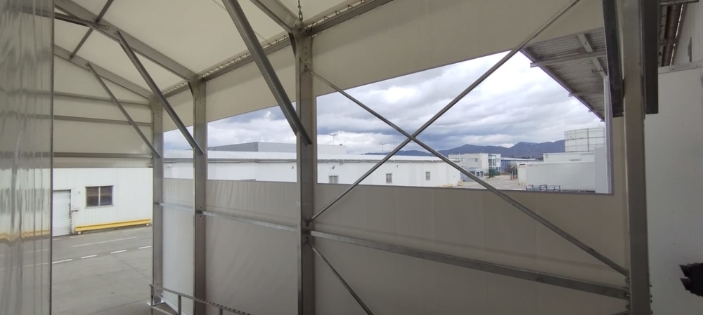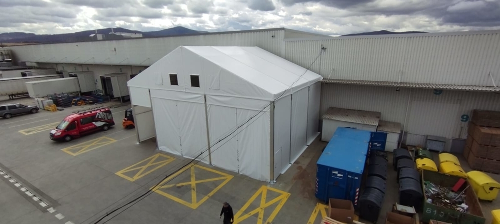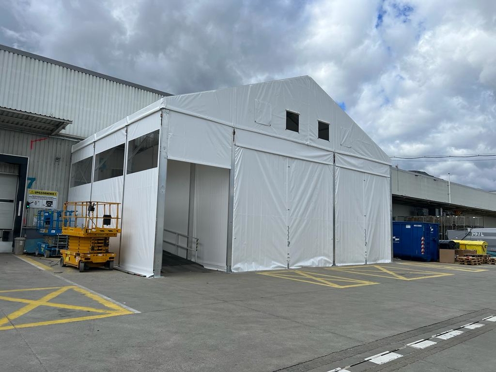 Velice specifická stavba stanového přístřešku o rozměru 15x11m s boční stěnovou výškou 6m. Zadní čelní stranou napojení na stávající výrobní halu, podélné rozdělení vnitřní plochy plachtovou zástěnou. Oddělena plocha kontejnerů od nákladové rampy. Přední čelo komplet rozhrnovací na několik částí. Umožněn tak přístup odvozu kontejnerů a pohybu VZ vozíků. Boční personální vstup. Přístavba slouží k ochraně manipulačních dělníků s odpadovým materiálem a návozu potřebného materiálu do výroby. Odclonění větru a prachu, zamezení okamžitého úniku tepla z výrobní haly.