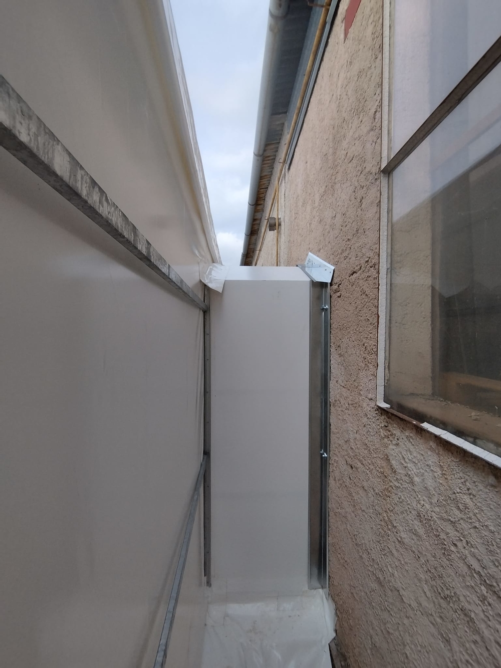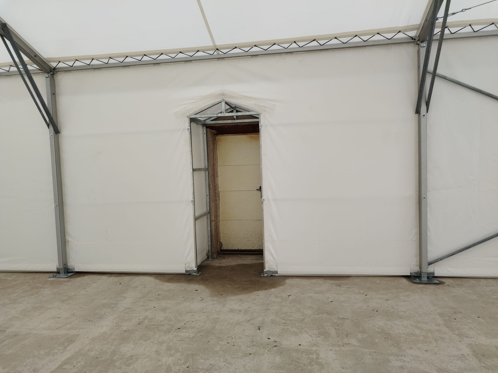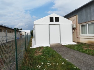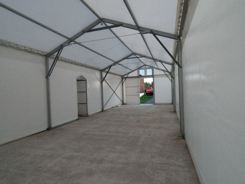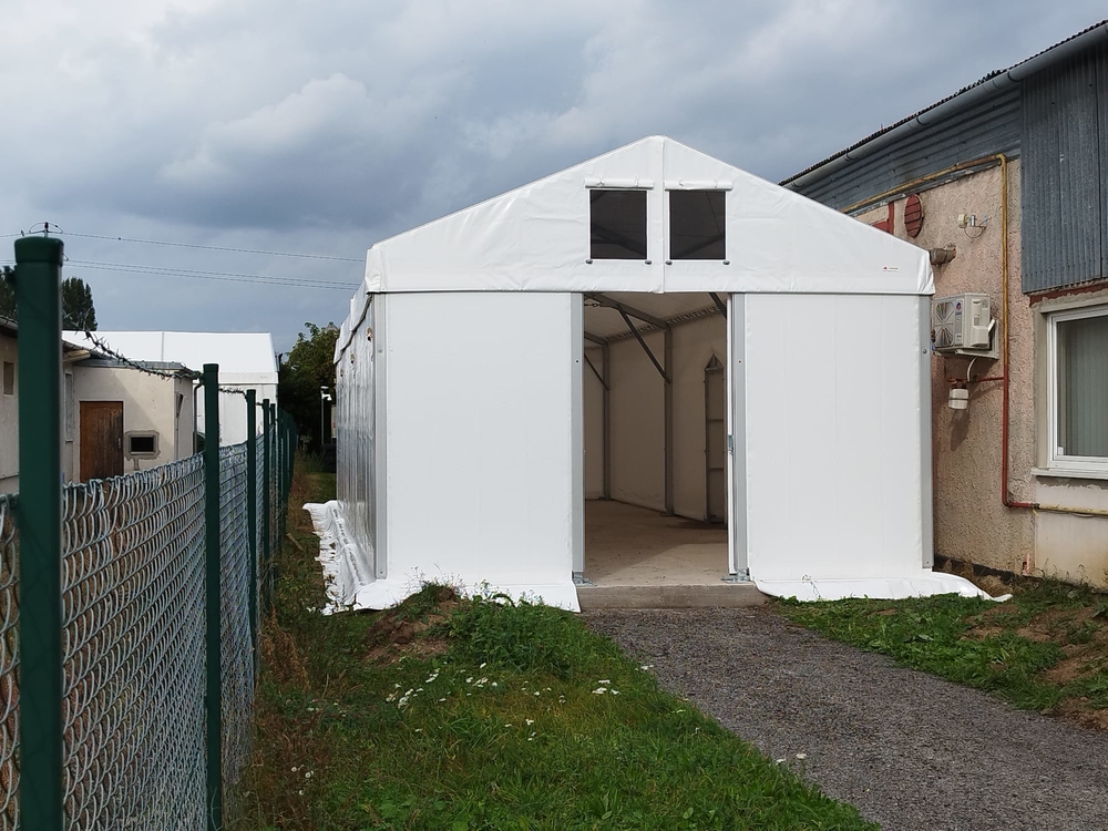 Ukázka uceleného malého projektu menšího provedení stanové haly o rozměru 5x15m s boční stěnovou výškou 3m. Příslušenství ve formě čelních středních vrata, propojovacího tunýlku se stávající budovou a spodní izolační plachtové obruby. Hala postavena na základové betonové desce. Vše dopředu domluveno a naprojektováno tak, aby byl výsledek plně funkční. Realizováno pro firmu AZ Pohony z Vojkovic.