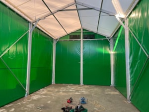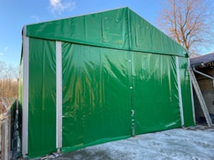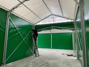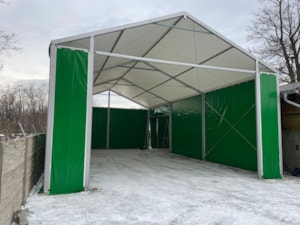 Vzhledem k naší zakázkové výrobě můžeme splnit teměř neomezené rozměrové požadavky na dané zastřešení a co nejvíce se přizpůsobit možnostem skladovací plochy, tak abyste ji mohli co nejvíce zúročit. Pro firmu Dřevovýroba VLK z Dubí jsme dodali stanové haly o rozměrech 8x14,5m a 5x8m s boční stěnovou výškou 4m propojené spojovacím tunýlkem. Byla tak zastřešena plocha o půdorysu písmene L s využitím každého volného místa.