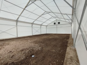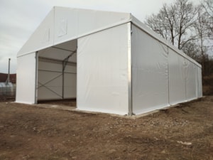 Pokud chcete mít jistotu ve správném ukotvení stanové haly na rostlém terénu můžete se inspirovat touto referenční stavbou. Klient zvolil levné a efektivní řešení pomocí betonových panelů vyskládaných do obvodu nosných patek konstrukce. Je tak zajištěna rovinnost založení a stabilita kotevních hřebů. Stanová hala 12x20m s boční stěnovou výškou 4,5m, čelní střední posuvná vrata. Provedeno pro firmu Plevka v Koječíně.
